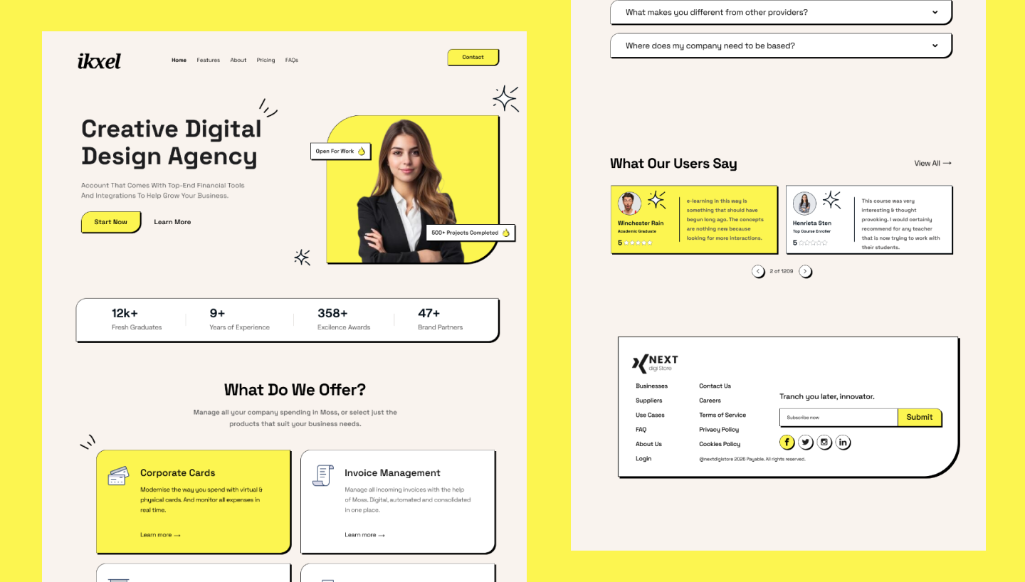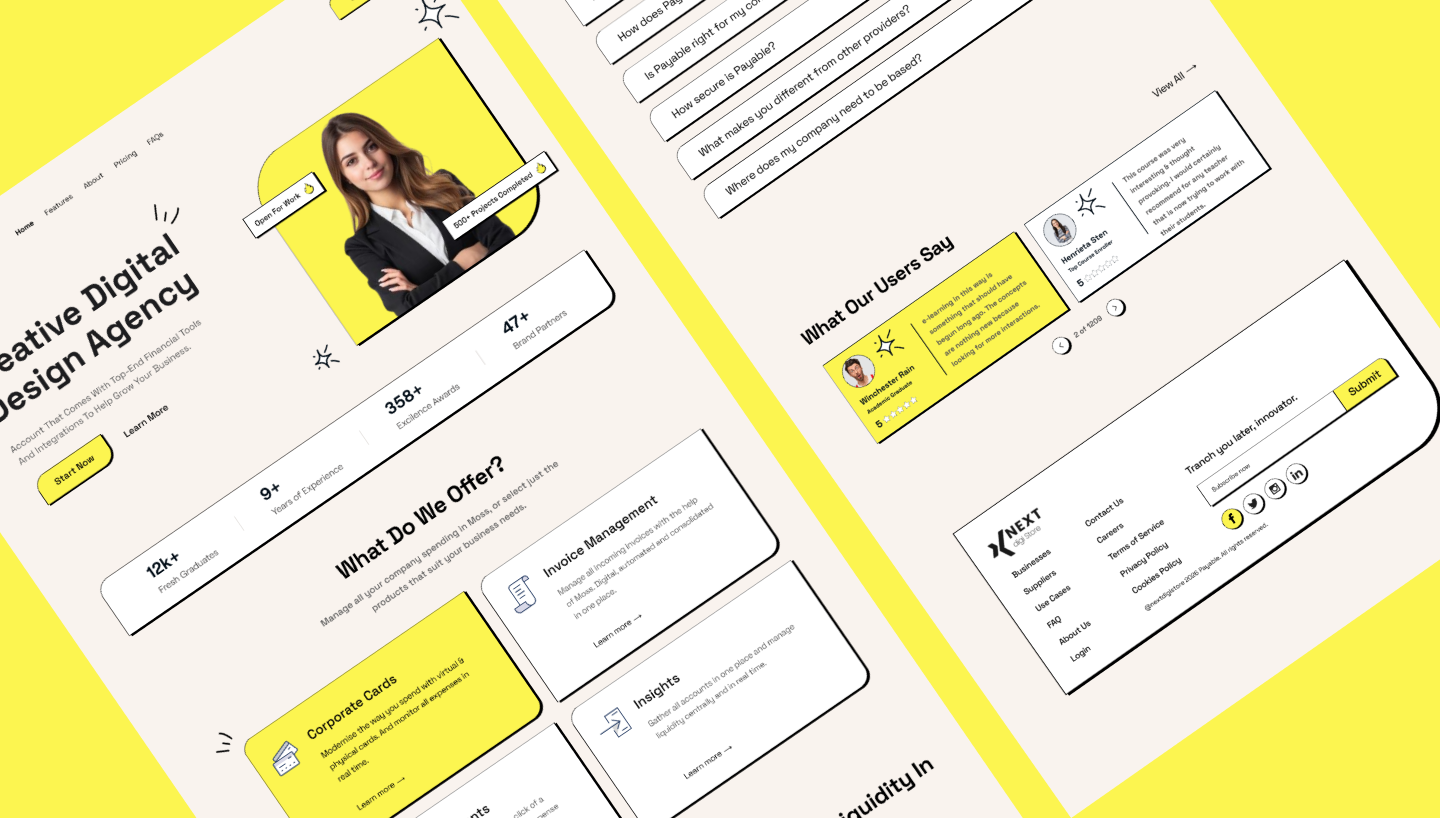 A modern and visually engaging Creative Agency Landing Page UI template designed to showcase agency services, creative portfolios, and brand identity with impact. Featuring a clean layout, bold visuals, and conversion-focused sections, this landing page is ideal for creative agencies, design studios, startups, and digital service providers. Available in Figma, XD, and Sketch formats, it allows easy customization to create compelling landing pages that attract clients and drive business growth.