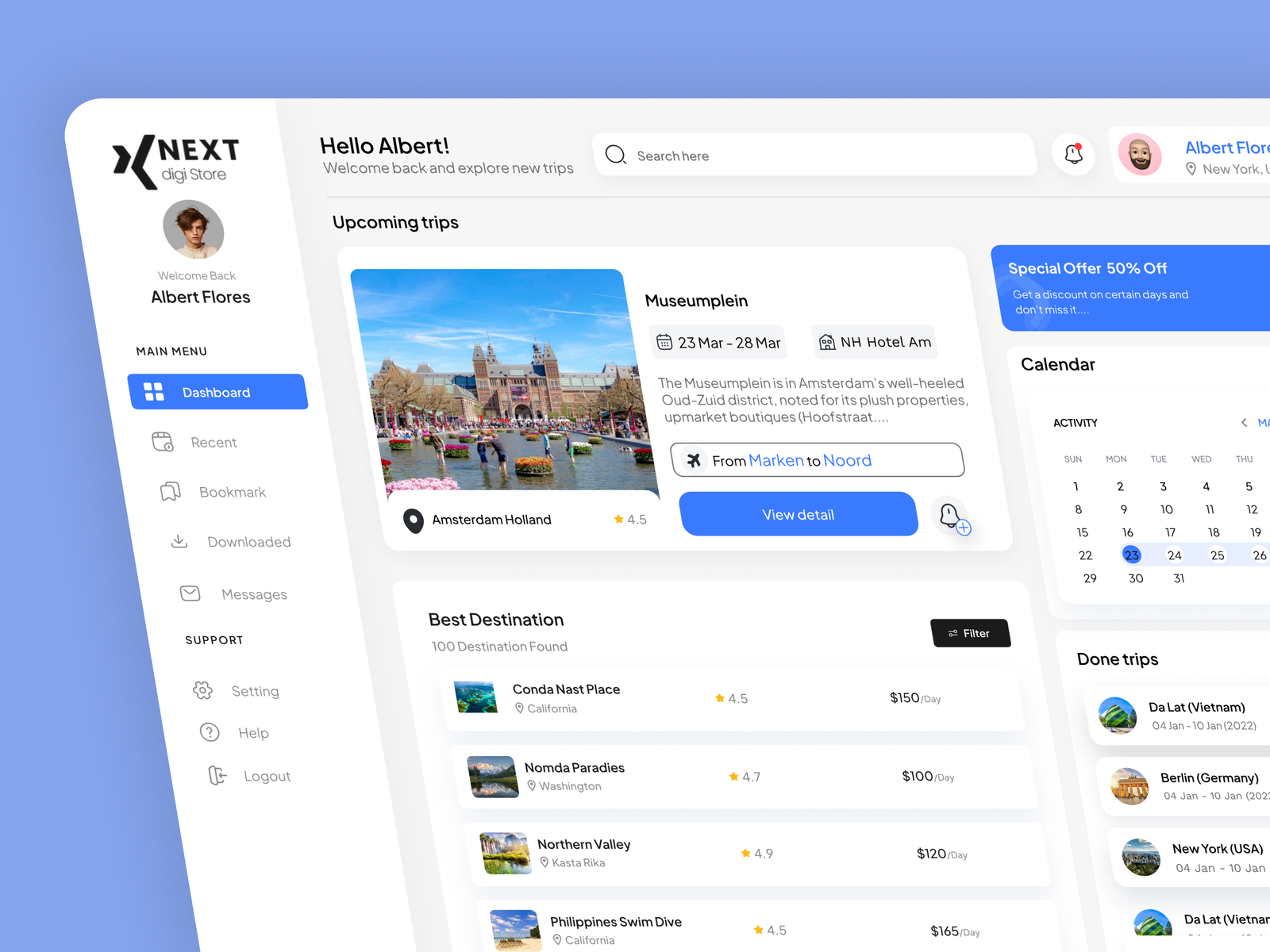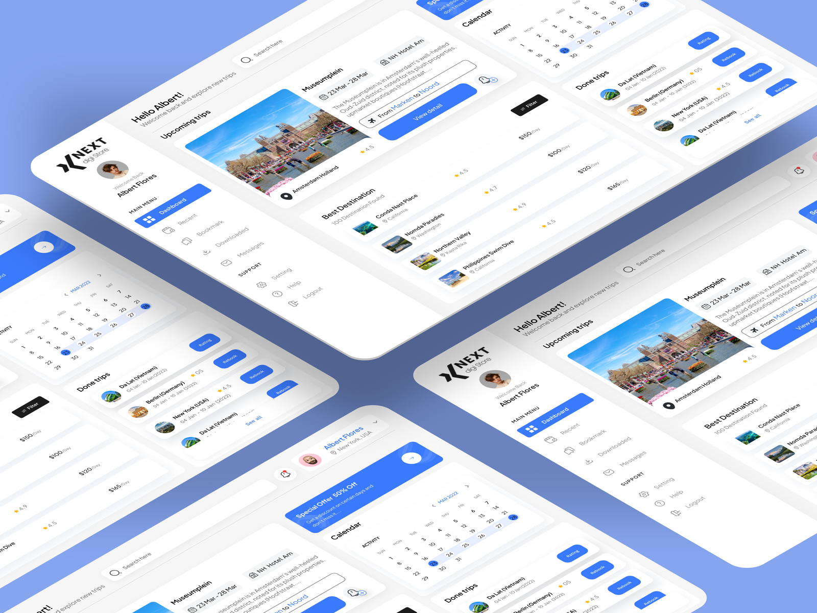 A visually engaging and modern Travel Dashboard UI template designed for managing travel data, bookings, destinations, and performance insights. Featuring a clean layout and intuitive data visualization, this dashboard is ideal for travel agencies, tourism platforms, booking systems, and travel-related SaaS applications. Available in Figma format, it allows easy customization to create stunning dashboards that enhance travel planning and user experience.