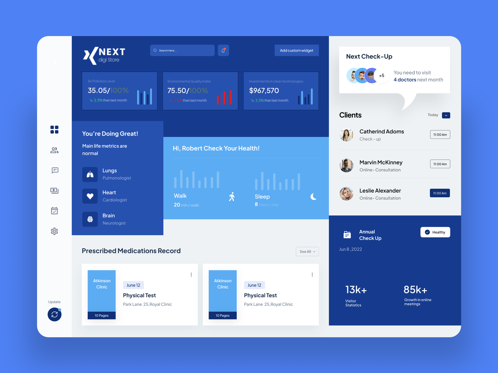 A modern and intuitive Medical Dashboard UI template designed for managing healthcare data, patient statistics, and medical analytics. With a clean layout and easy-to-read visual components, this dashboard is ideal for hospitals, clinics, healthcare systems, and medical management platforms. Available in Figma format, it allows designers and developers to quickly customize layouts and build efficient, data-driven medical dashboards.
