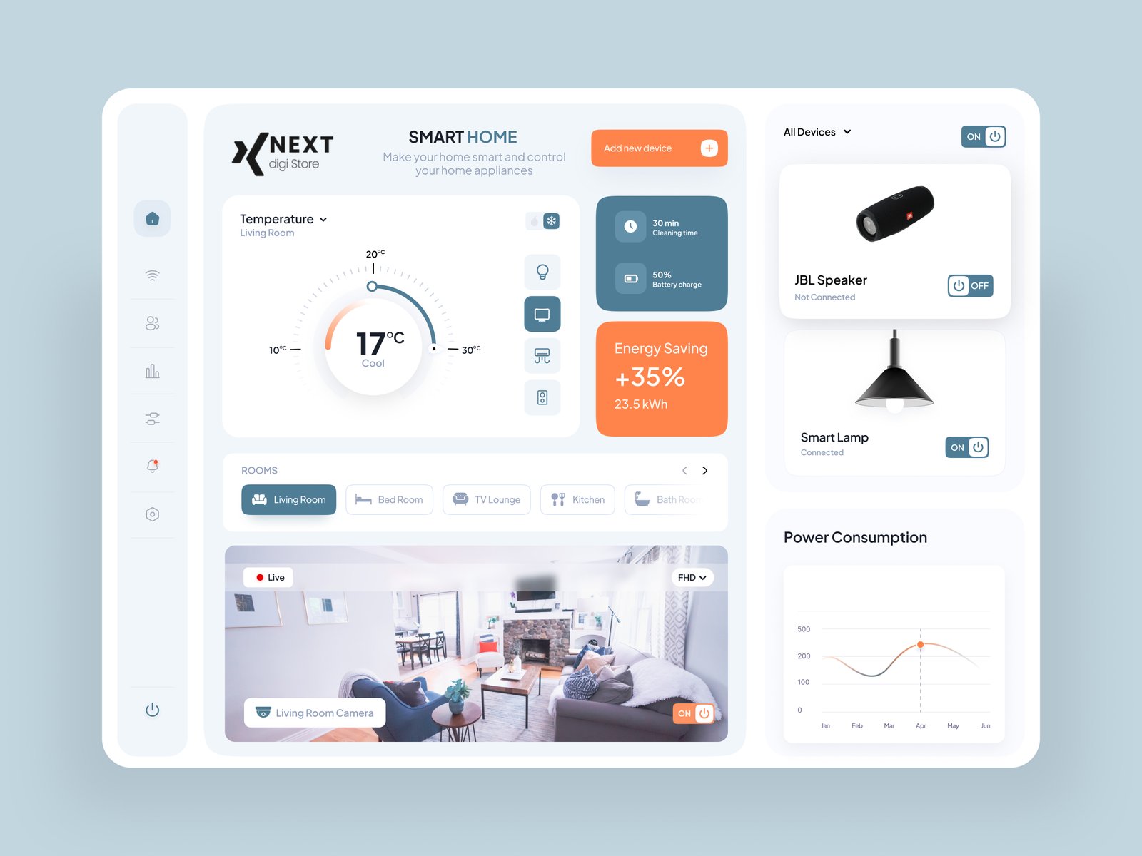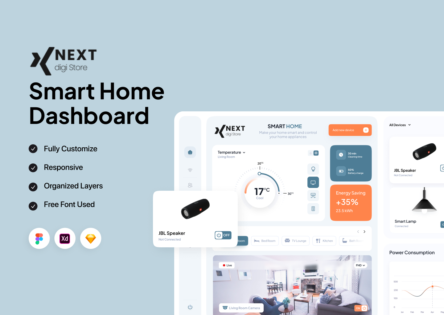 A modern and intuitive Smart Home Dashboard UI template designed to monitor and control connected devices, automation systems, and real-time home data. Featuring a clean layout, easy-to-read controls, and smart visual components, this dashboard is ideal for IoT platforms, smart home applications, home automation systems, and connected device interfaces. Available in Figma, XD, and Sketch formats, it enables designers to quickly customize layouts and build efficient smart home dashboards.