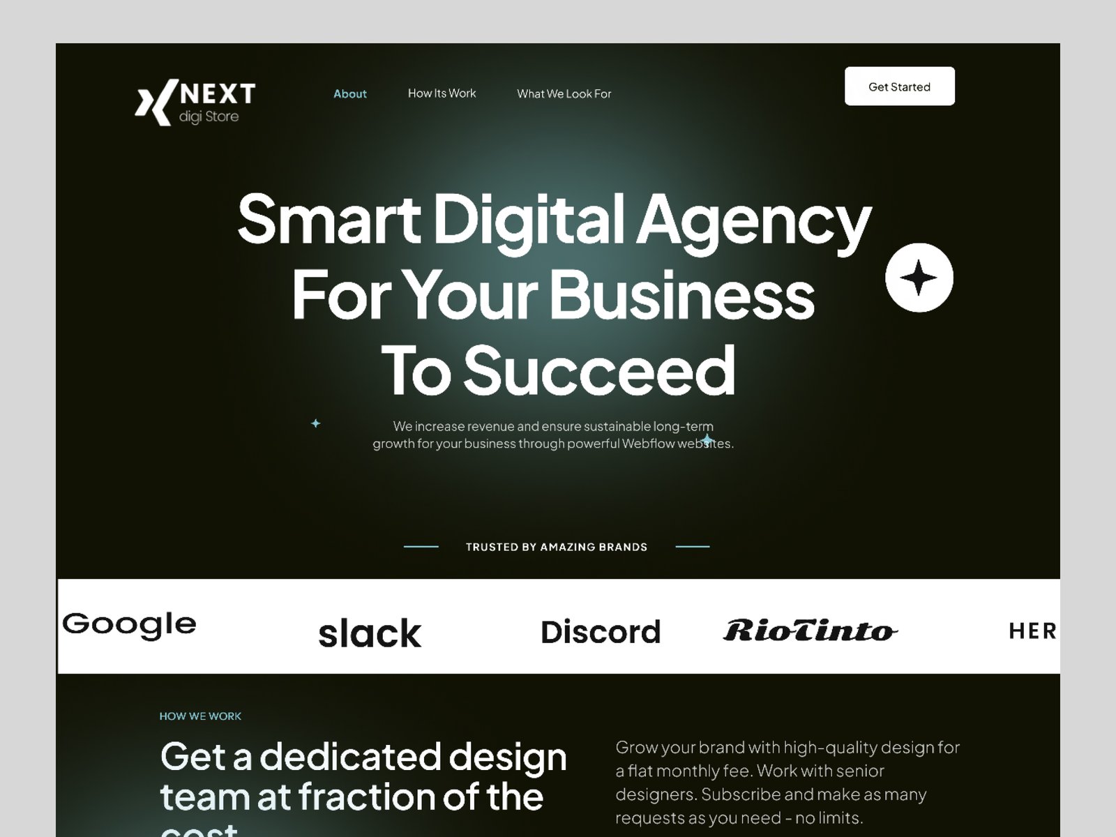 This design agency landing page template provides a sleek and modern layout, designed to showcase your agency\'s services and portfolio in a visually appealing way.